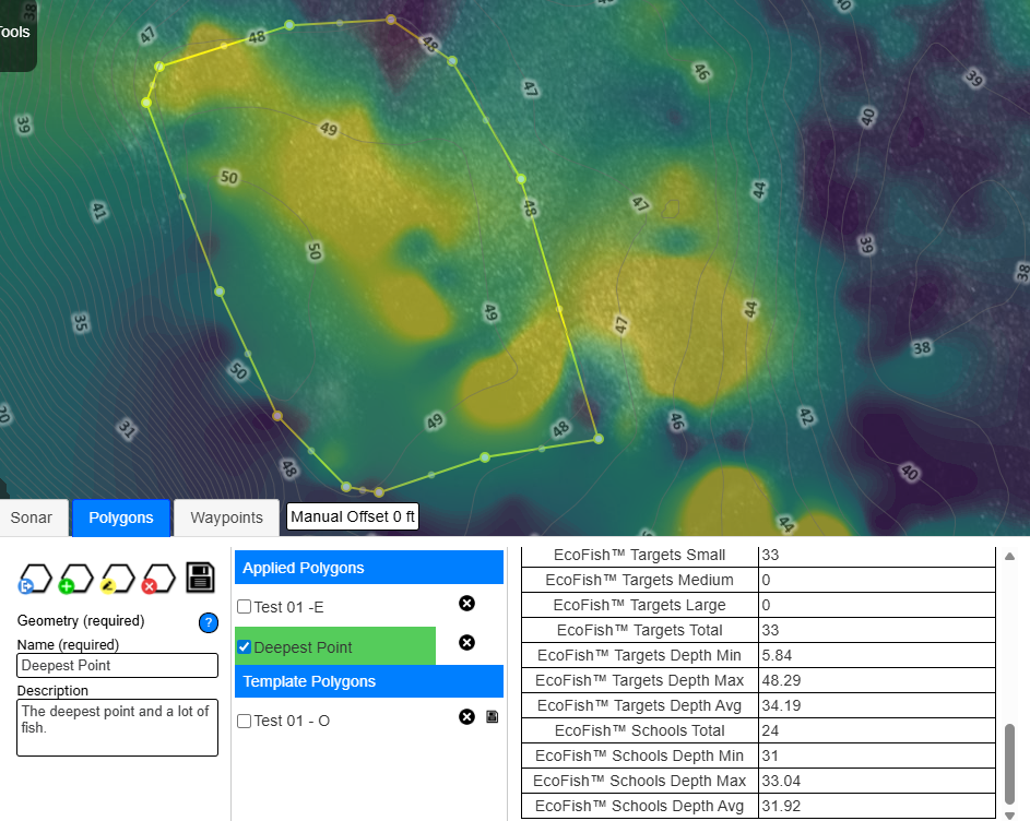 Select the Polygons tab from the BioBase trip viewer to view the GIS Polygon tool. GIS polygon tool is used to trace areas of interest on the map and generate area analysis and statistics.