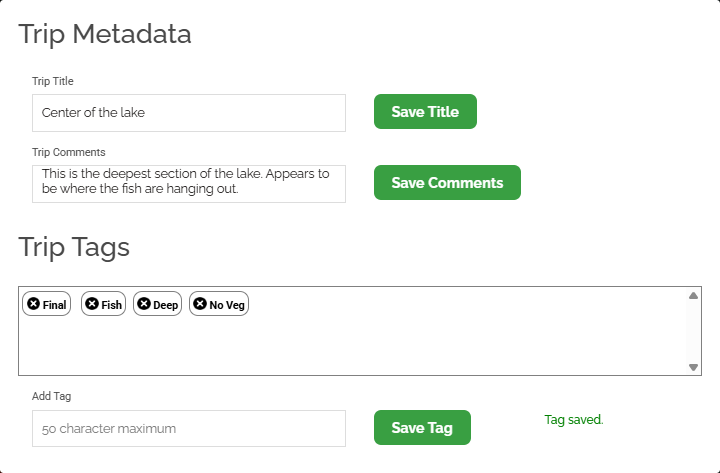Use Trip Metadata to add a Trip Title, Comments, and Tags. These fields improve organization and enable more effective searching on the Search Page.